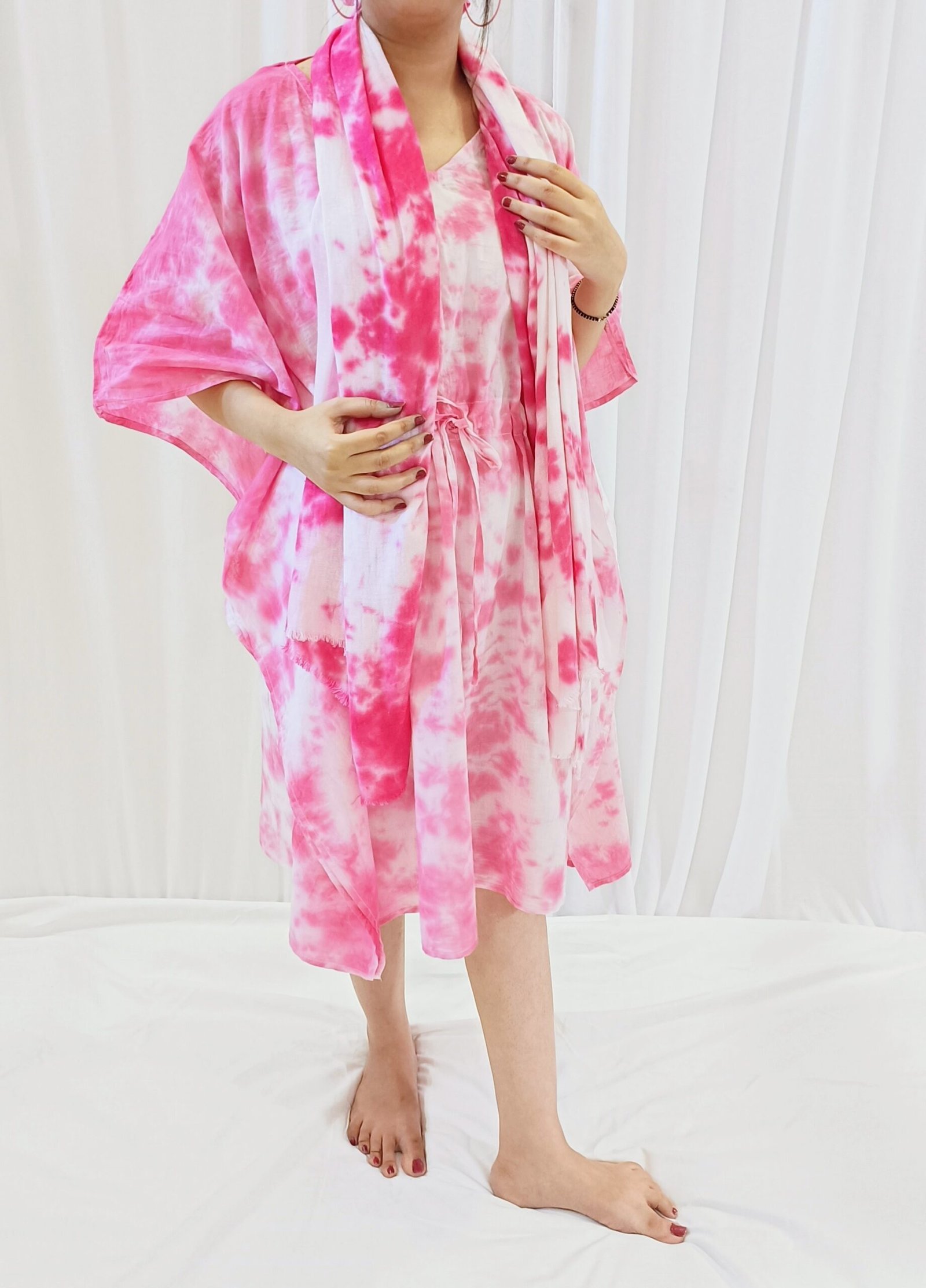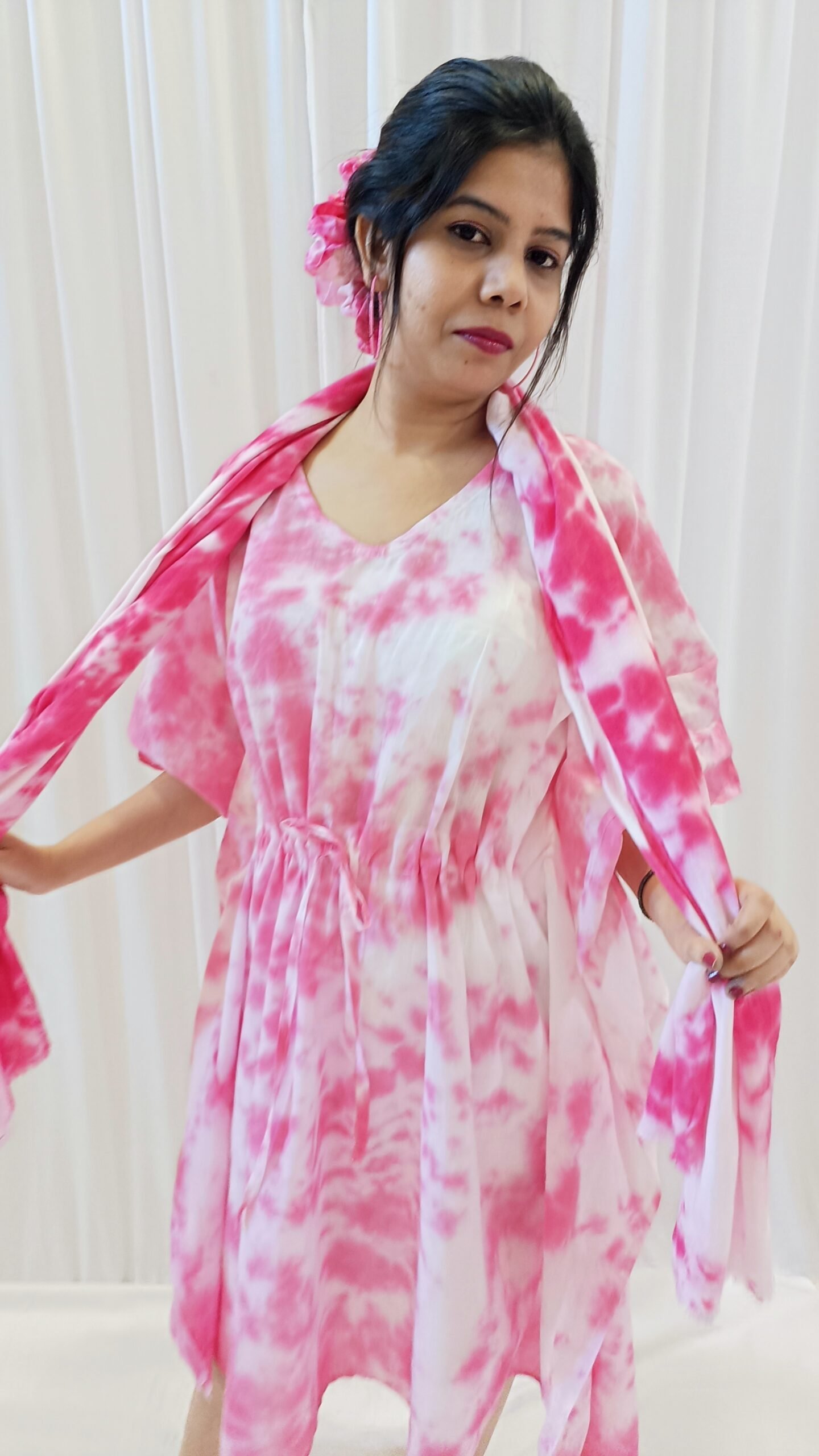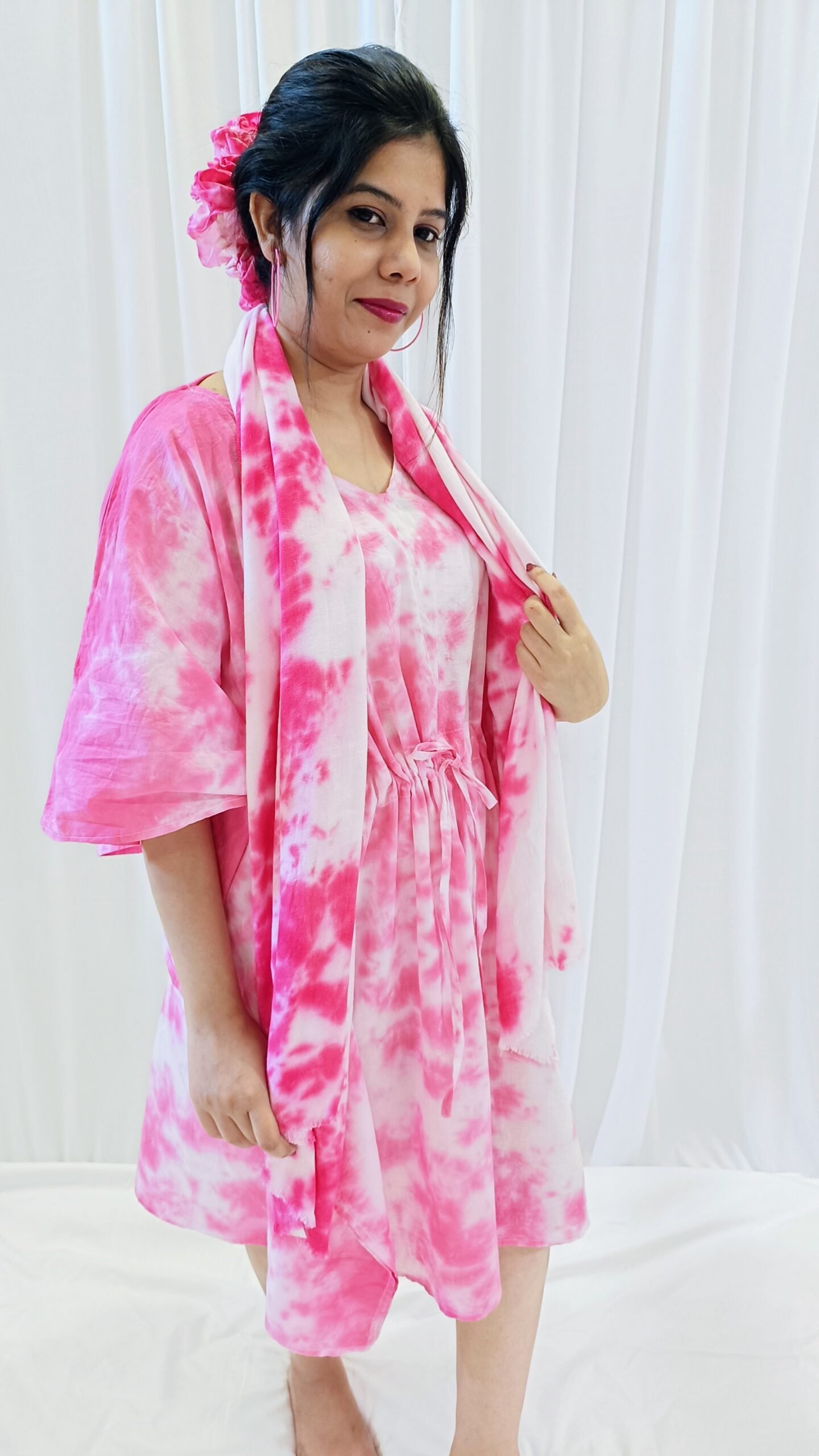 Elevate your everyday style with this pink tie-dye stole, a versatile accessory perfect for all seasons. Crafted from lightweight, breathable fabric, it drapes effortlessly around the shoulders, offering comfort and elegance whether worn in warm or cool weather. The rich red hue and hand-dyed tie-dye pattern add a bold, artistic flair to any outfit, from casual daytime looks to evening ensembles. Use it as a scarf, shawl, or wrap—its generous length and soft texture make it a year-round favorite. Each piece is uniquely dyed, making your stole one-of-a-kind and a stylish statement piece for every wardrobe.
