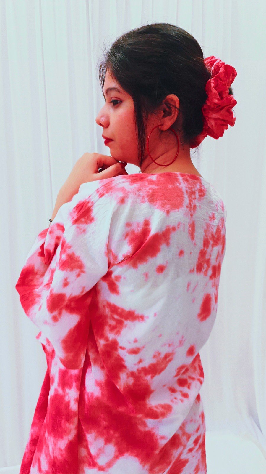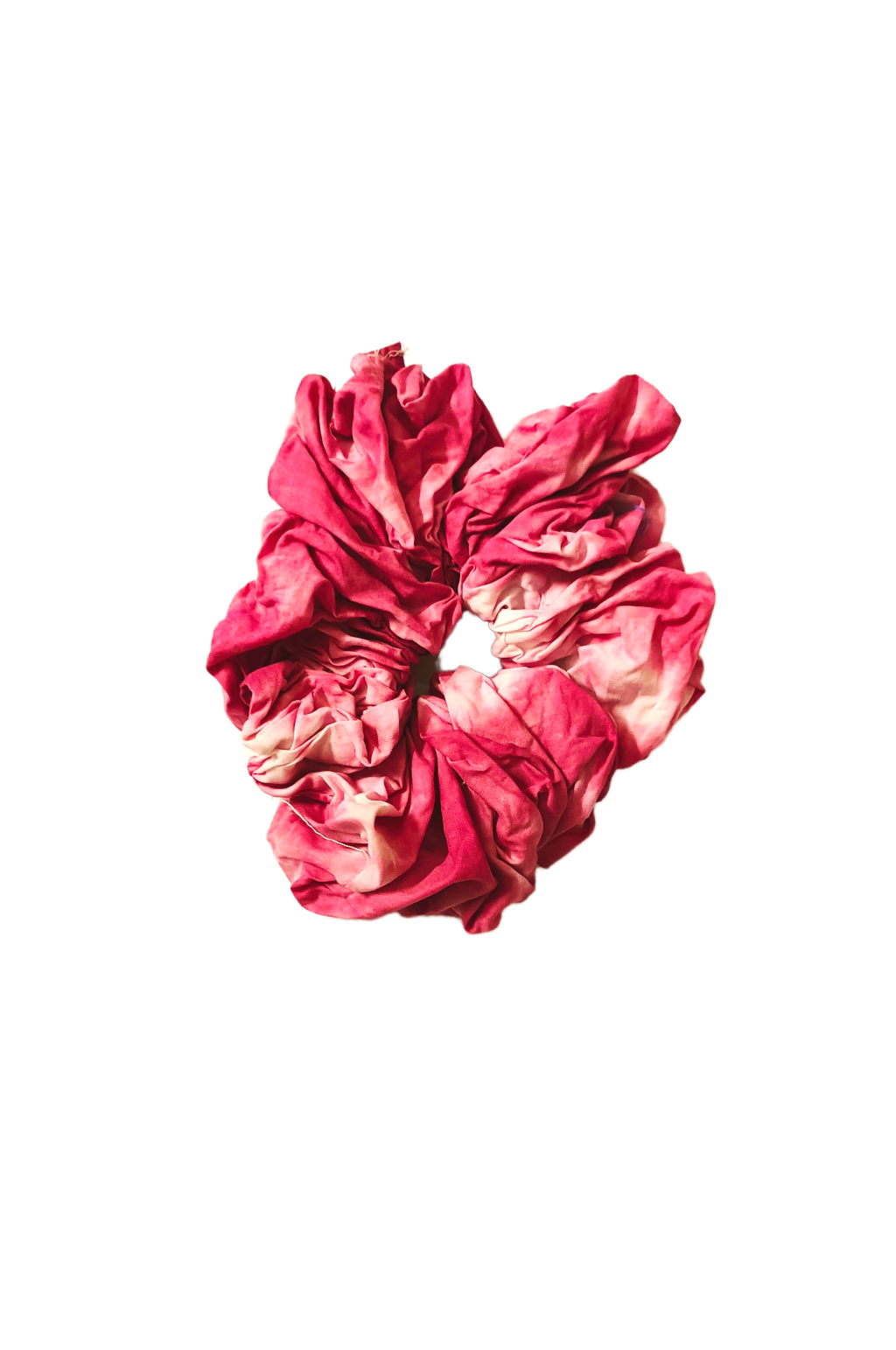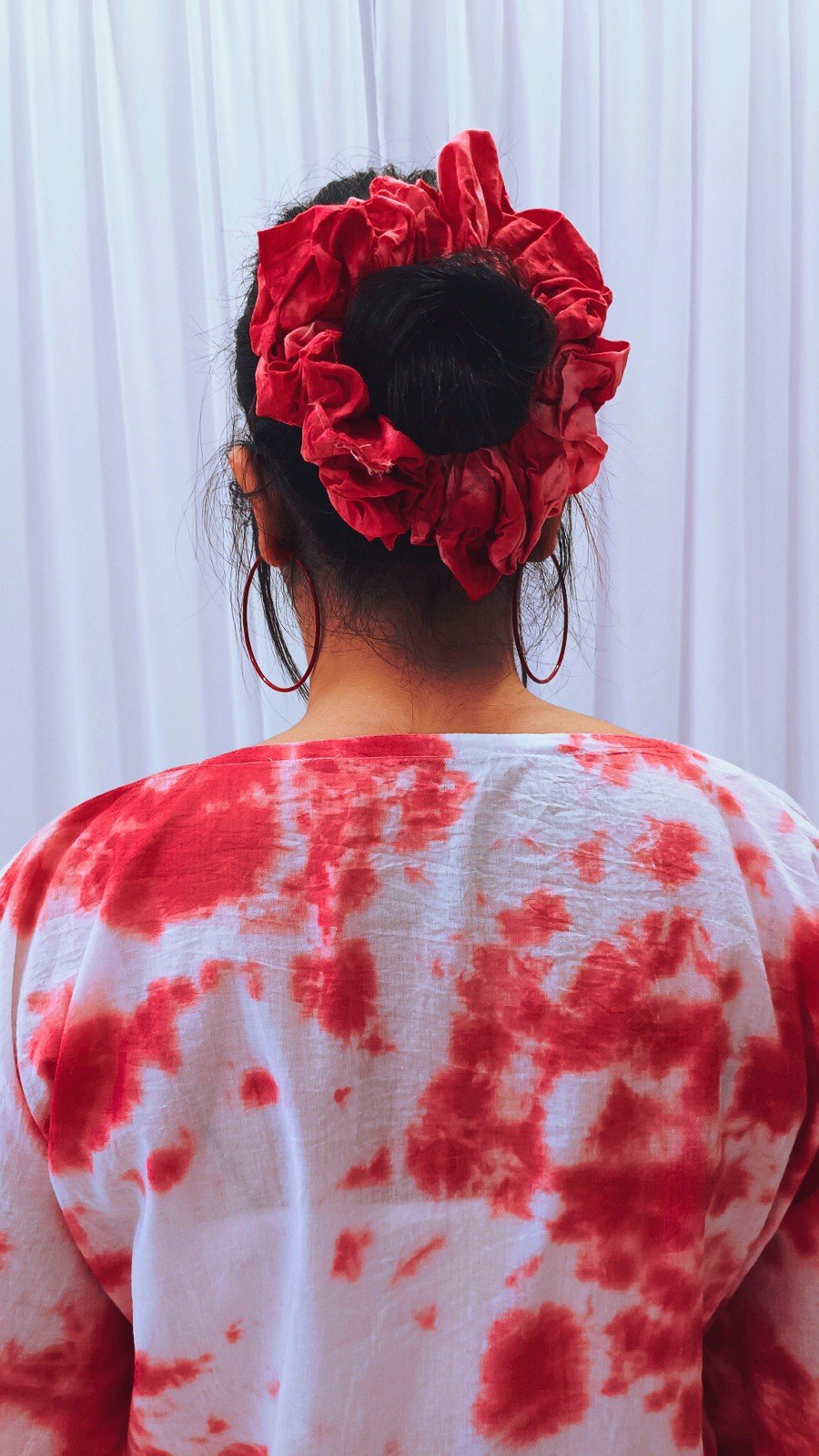 Soft red tie-dye cotton scrunchie, perfect for daily wear with a unique handmade look and gentle hold.